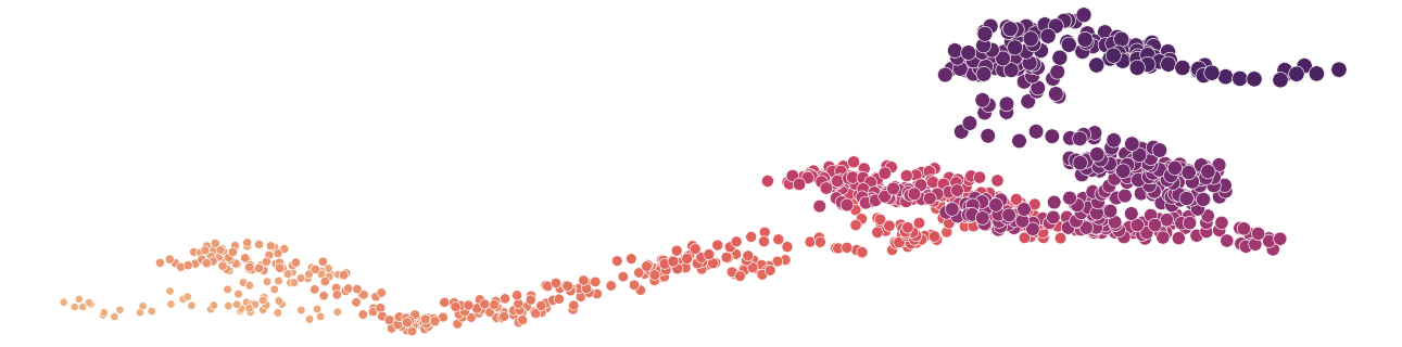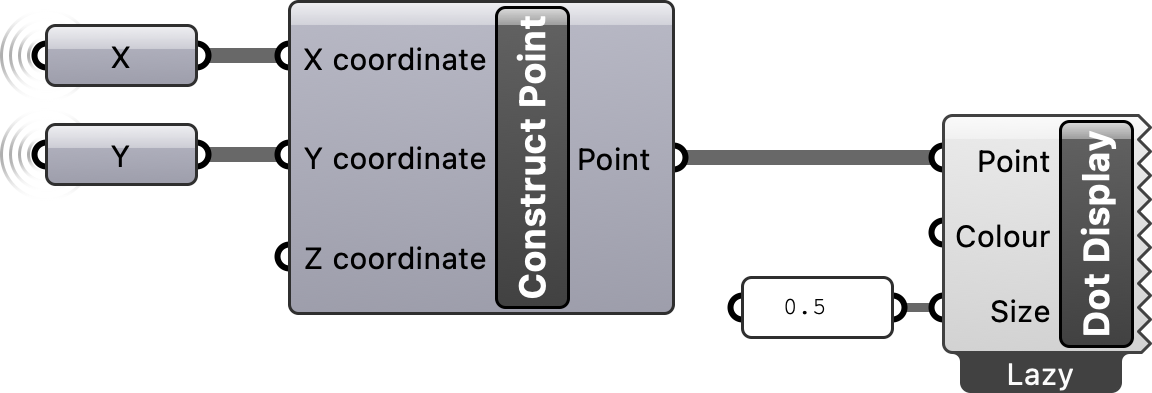 The Mass Addition component returns a result - the total cumulative sum - and a list of partial results - the cumulative sum at each step. These partial results represent the x- or y-components of our walker’s position in space at each step. To plot our walkers position in space, place a Construct Point on the canvas and plug the partial results of the cumulative sums along the x- and y-vectors into its input x- and y-coordinates. Finally visualize the resulting points using a Dot Display component.