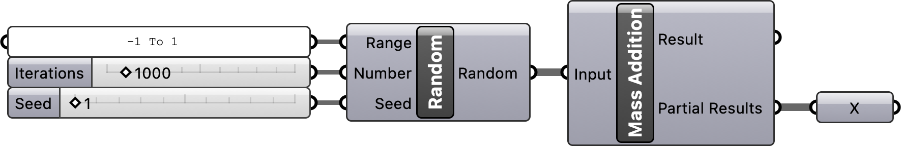 First define the x-component of our walker’s movement. We will represent a full pace to the west as -1 and a full pace to the east as 1. Start by generating a list of random floating point numbers between -1 and 1. To do this, place a Random component on the canvas. Plug a Number Slider into the Seed input parameter to set the seed of the pseudorandom number generator. Plug a Number Slider into the Number input parameter to set the number of random values to be generated. Plug a text panel into the Range input parameter and set the text to -1 to 1. Then plug the output list of random numbers into a Mass Addition component. This will calculate the cumulative sum of the random numbers.