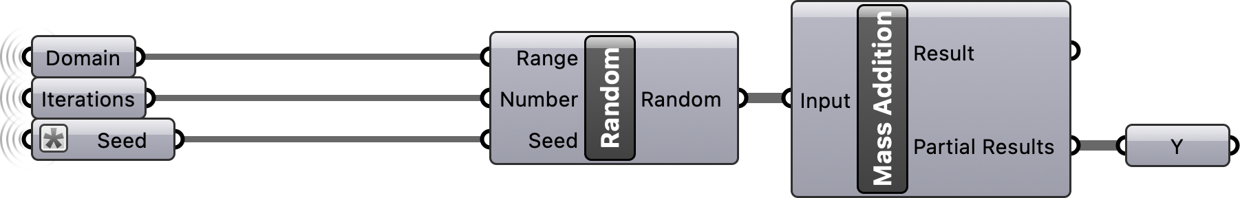 Next define the y-component of our walker’s movement. Place a Random component on the canvas and use the same values for the input Range and Number, but use a different value for the input Seed. A simple way to do this is to reuse the same seed, but add 1 to it. Then use Mass Addition calculate the cumulative sum of the resulting list of random numbers.